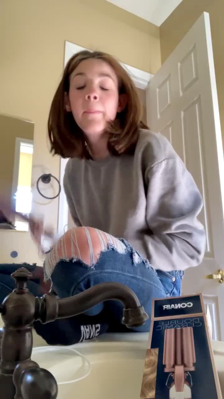 A teen girl dances on a countertop, then she falls down, turns the faucet on, and gasps in a bathroom.