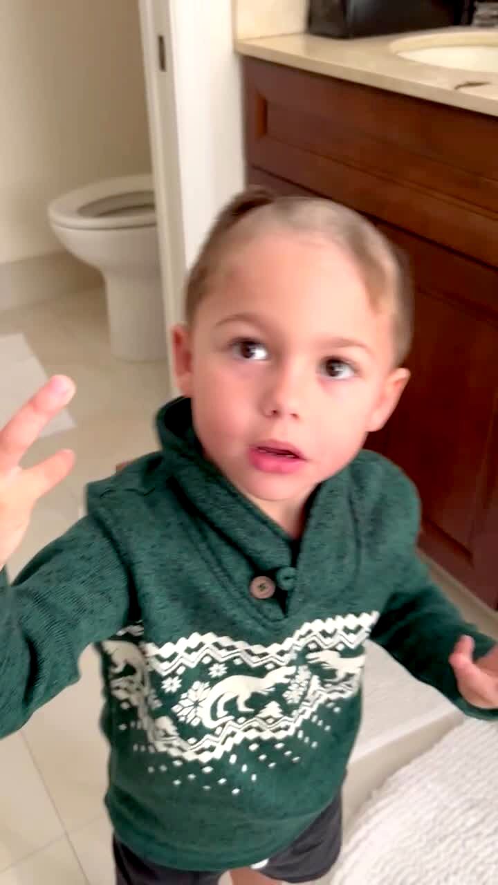 A tot boy has shaved the middle of his hair in a bathroom, and he tells a woman that he made himself "beautiful."