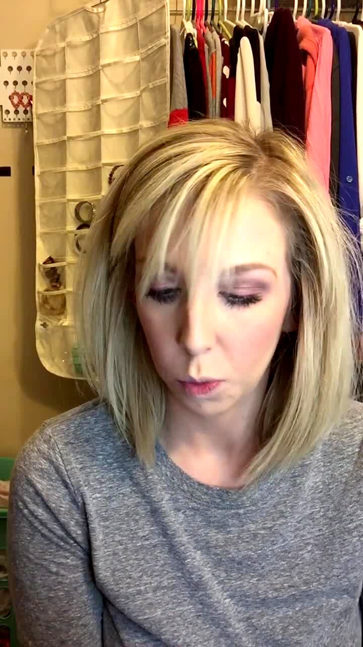 A woman makes a sales video about a makeup spray in a closet, then she falls backwards out of her chair, and she holds up the chair to show that it broke.