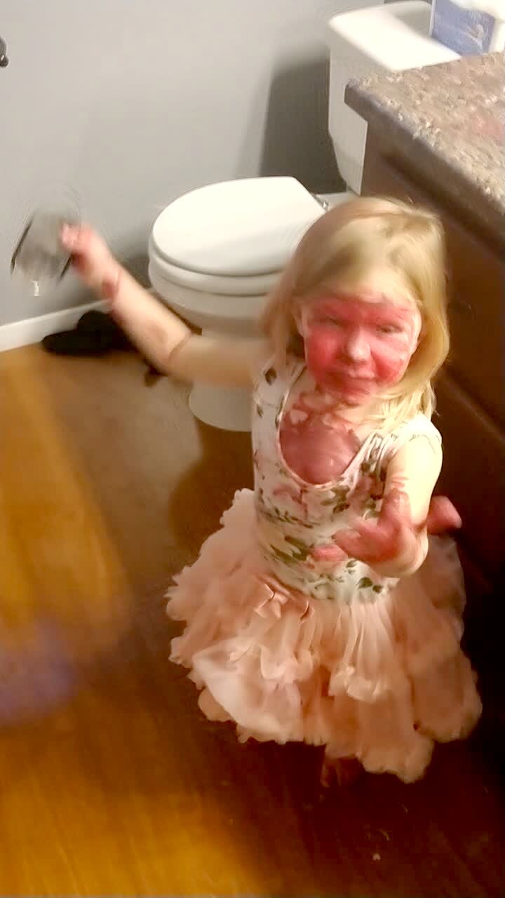 A tot girl paints herself with makeup and draws on a bathroom wall and mirror and tells her dad she did it for her mom.