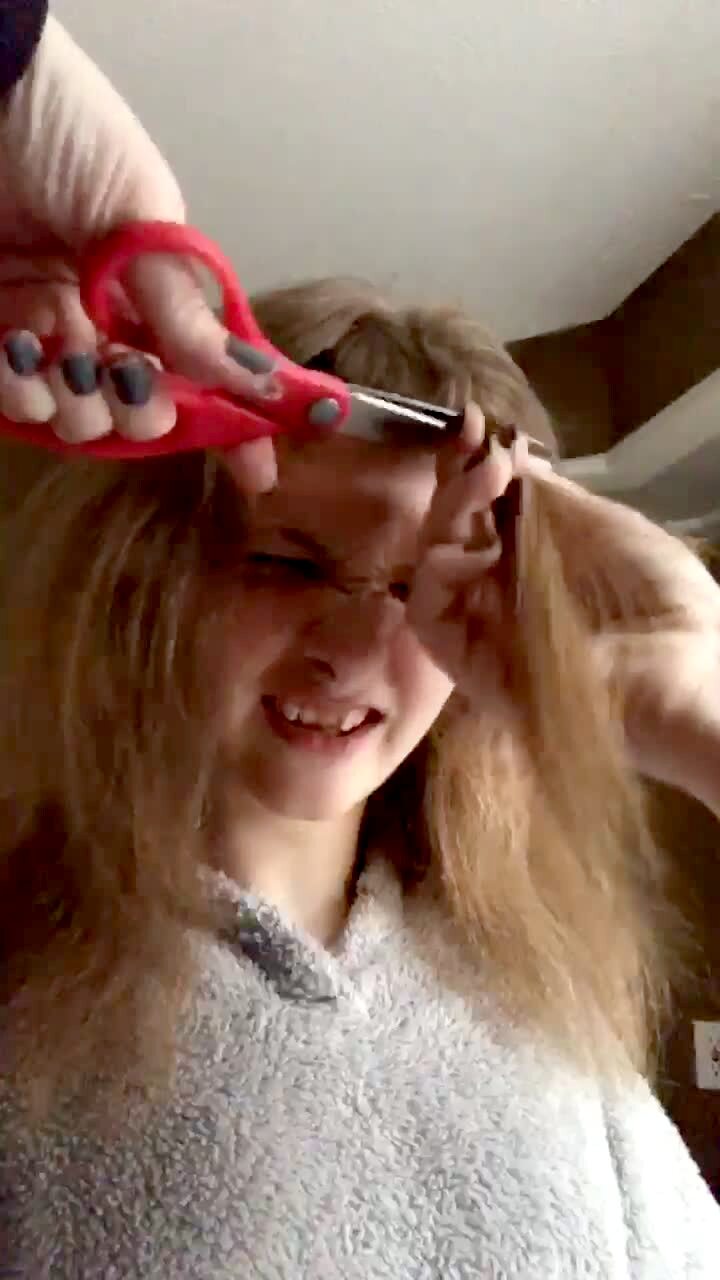 A young girl's sister cuts her bangs completely crooked in the house.