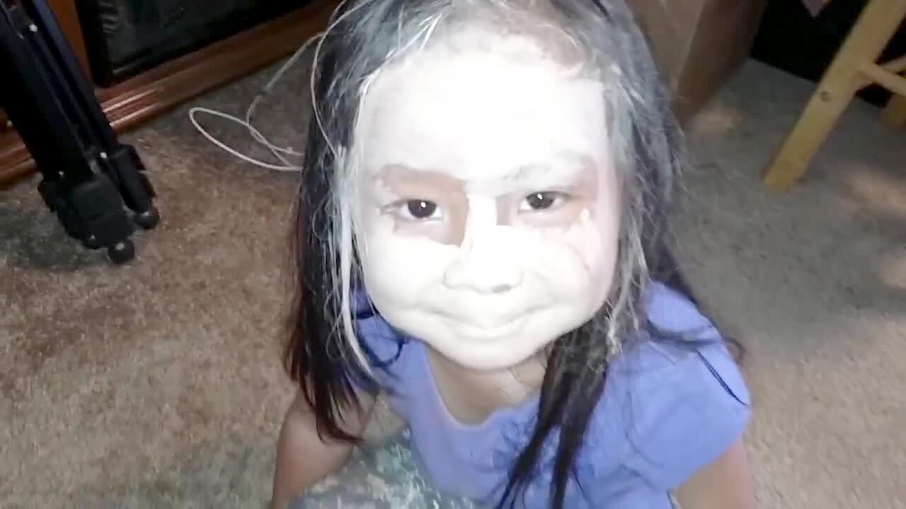 A young girl opens a bag in the bathroom as she starts a beauty tutorial, and the powdered cosmetic gets all over her.