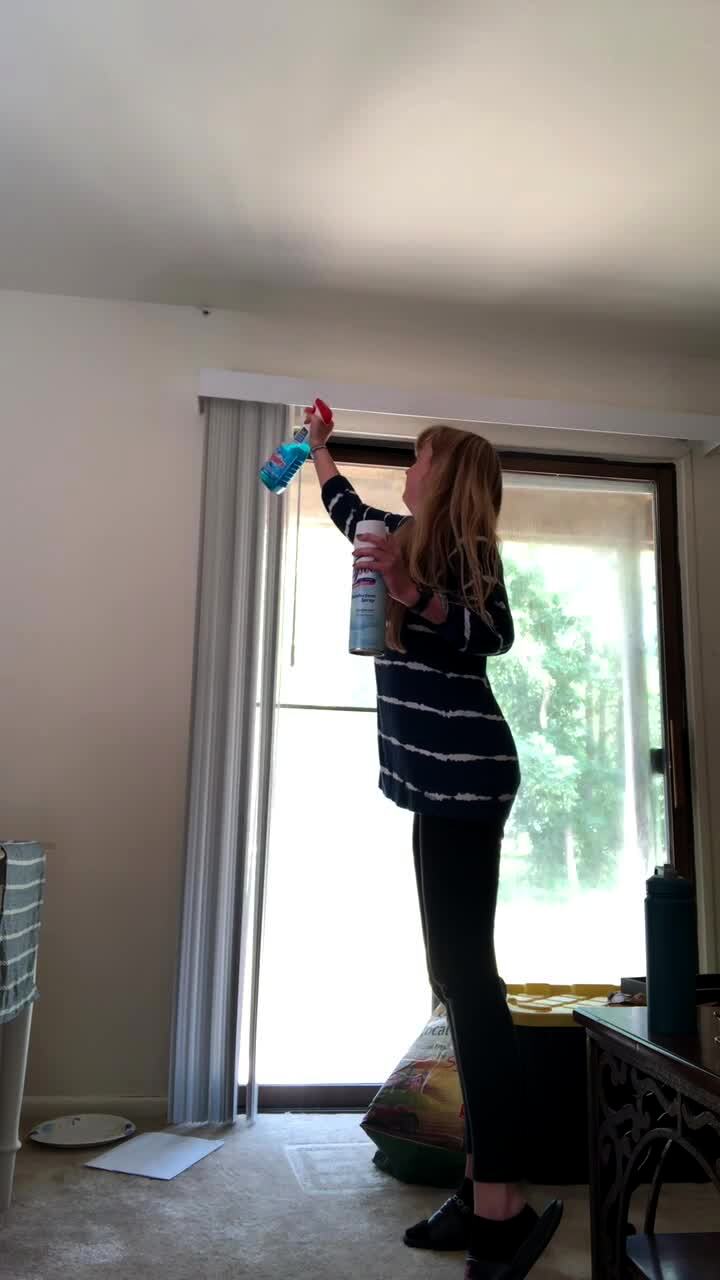 A woman sprays a bug on the living room ceiling to kill it but it jumps at her instead. She screams as loud as a person could scream and runs out of the room.