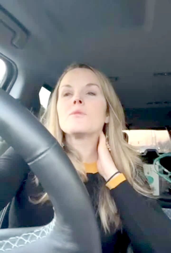 A woman records herself in her car, then she yells "spider" and leans back in her seat.