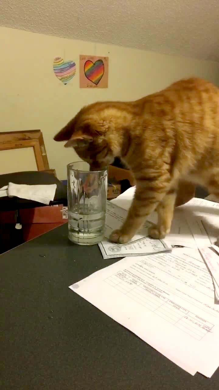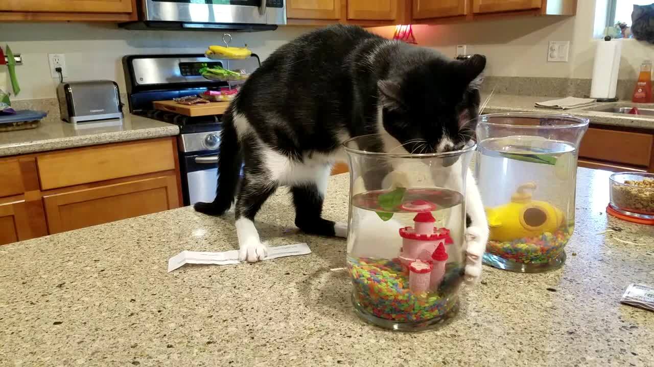 A cat watches a fish in a large glass of water from above and paws at the air beside the container.