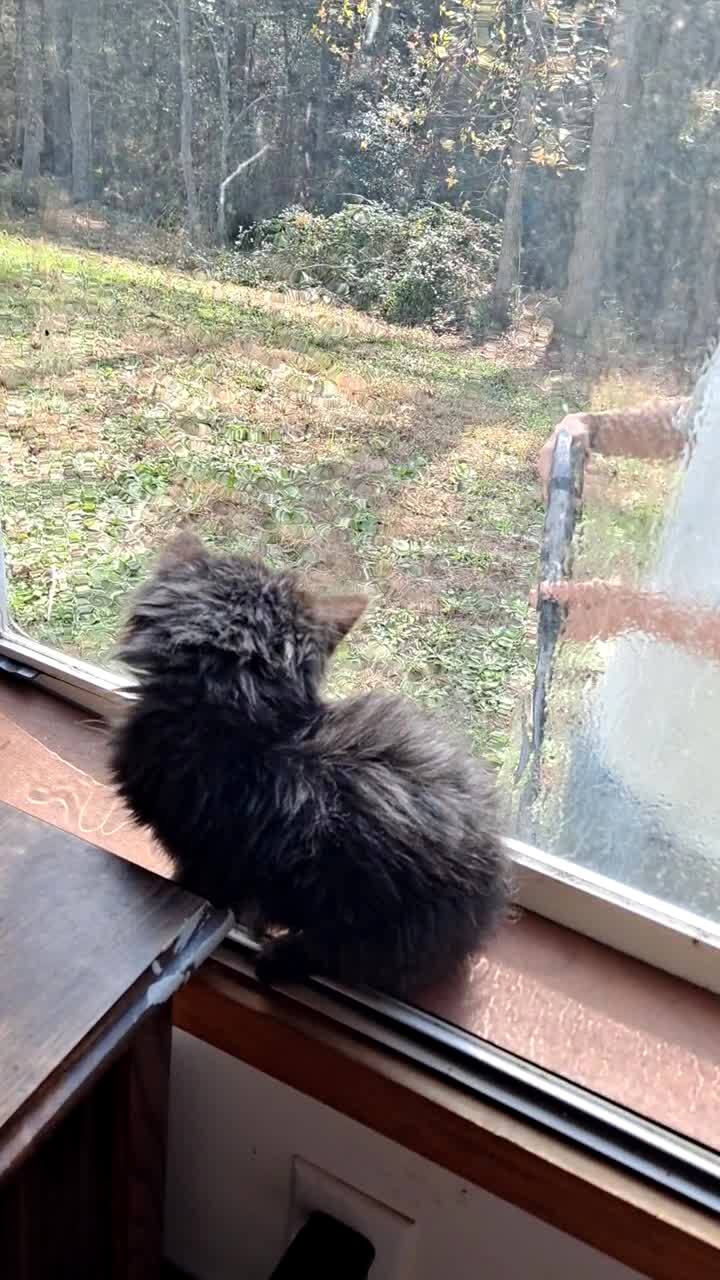 A kitten cat jumps and falls off of a window sill at home when a man power washes the glass from the other side.