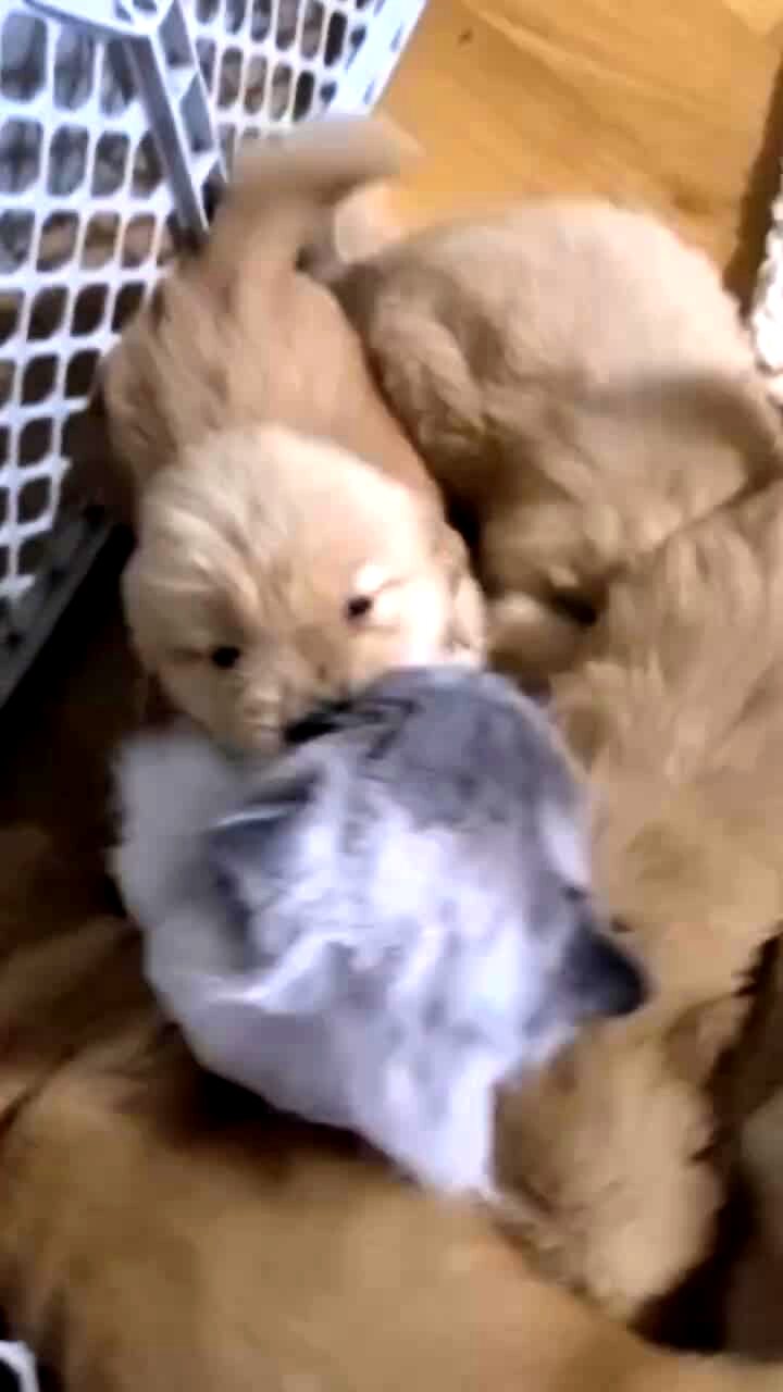 A bunch of puppy dogs climb on top of a cat who can only take so much before it runs away.