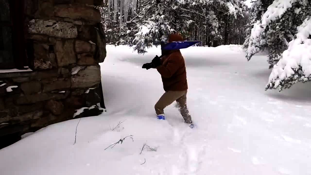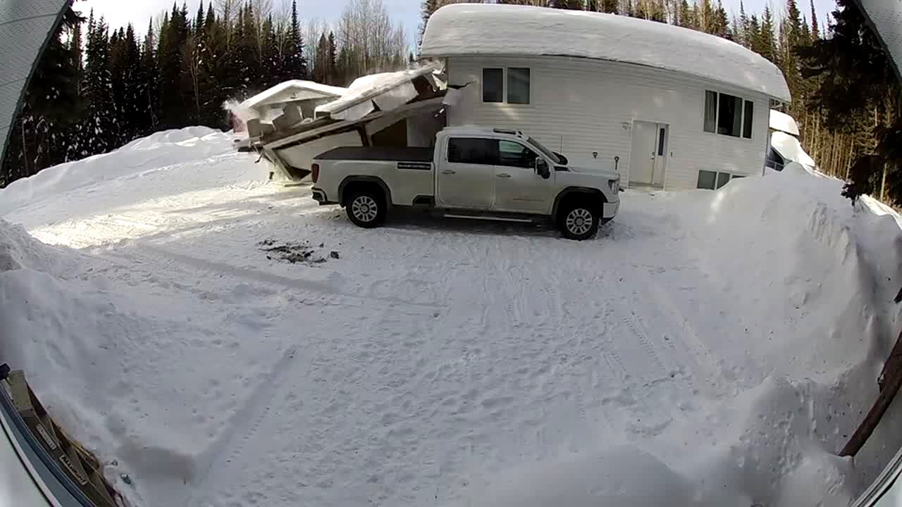 A garage roof caves-in from a heavy pile of snow resting on top of it. It just avoids hitting a person and their truck. Security footage.