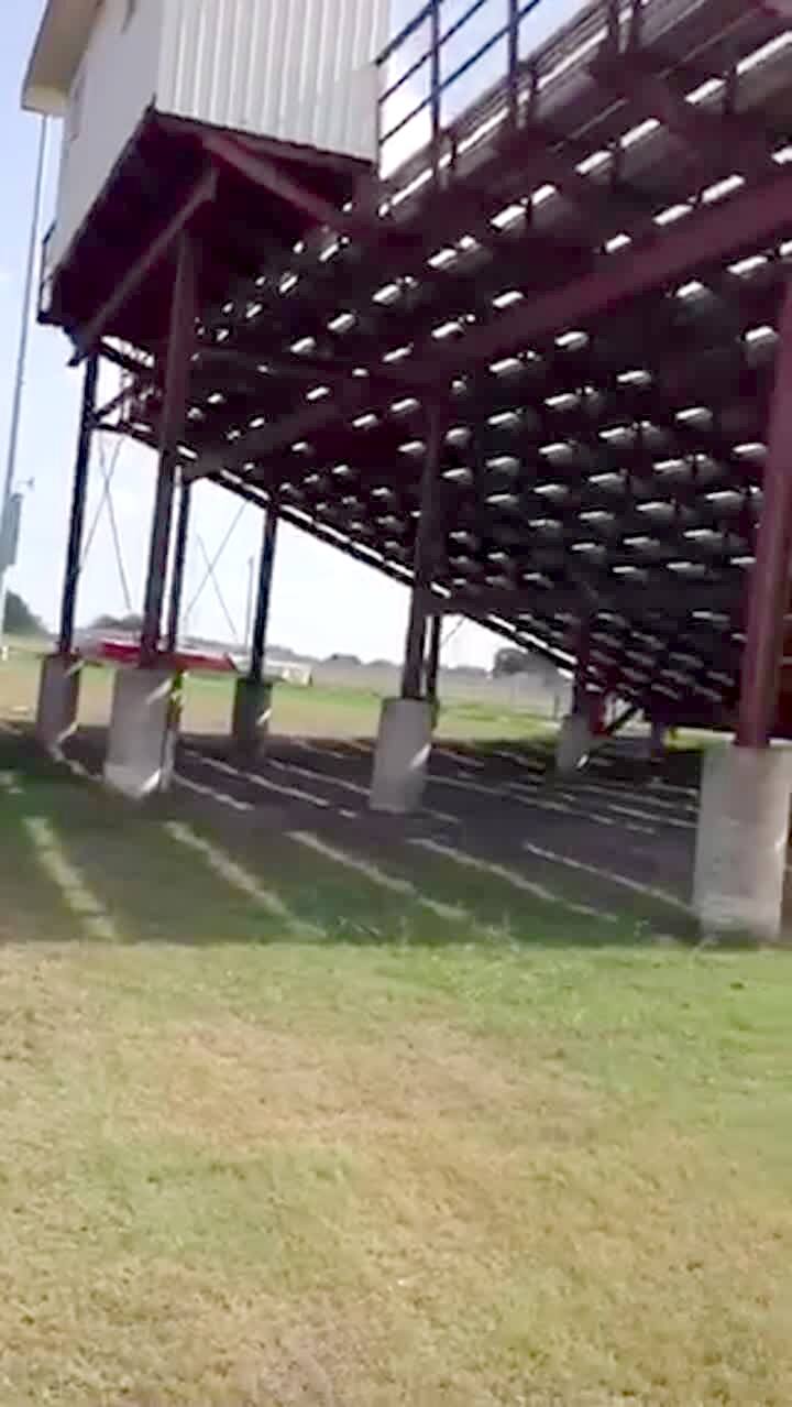 A man uses a truck to pull a building off a stand of bleachers. The building falls on to a dumpster and breaks apart.
