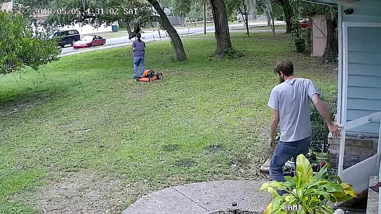 A man pushes a lawnmower through the yard and a tire rolls down the street after it comes off a car and it rolls up to him and hits the lawnmower. Security footage. Featured talent cleared only (the man pushing the lawnmower and the person who comes out of the house).