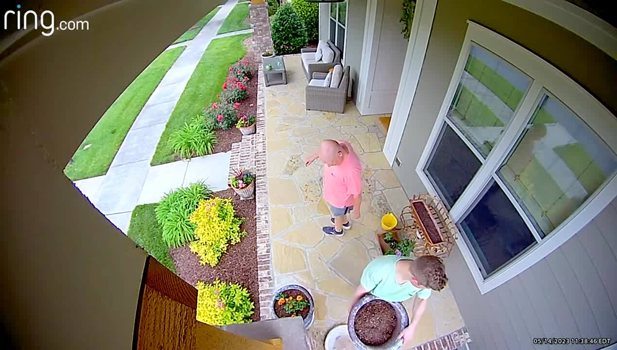 Two young boy brothers reverse their four wheeler into a parked car on the driveway. Their mother comes out of the house, and one of them blocks the dent with his body. Security footage.