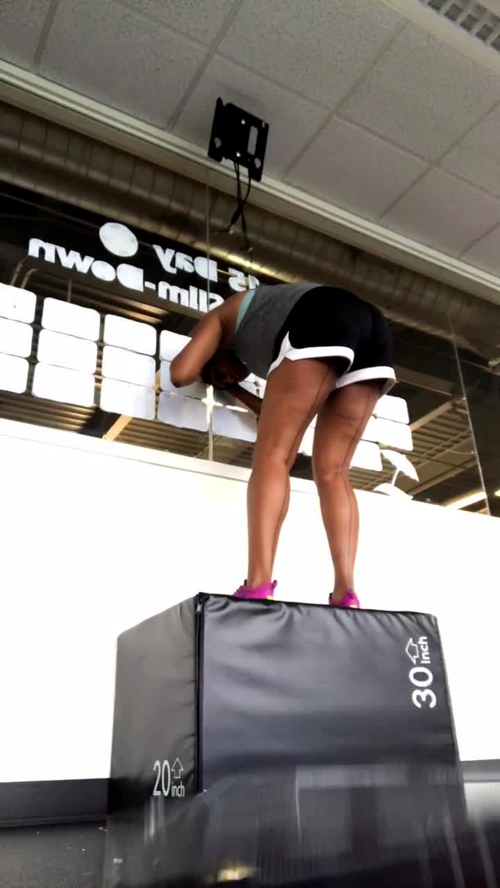 A woman attempts a box jump while exercising at the gym. She hits her head on a TV that hangs from the ceiling and it falls on her. Featured talent cleared only (the woman who jumps onto the platform).