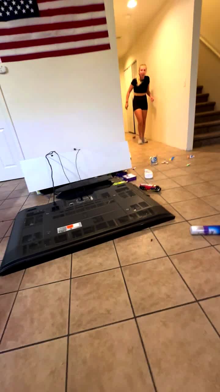 While inside the house a dog runs to fetch a ball. Her leash gets stuck on a television stand which knocks a large flatscreen television over, destroying it when it falls onto the floor.