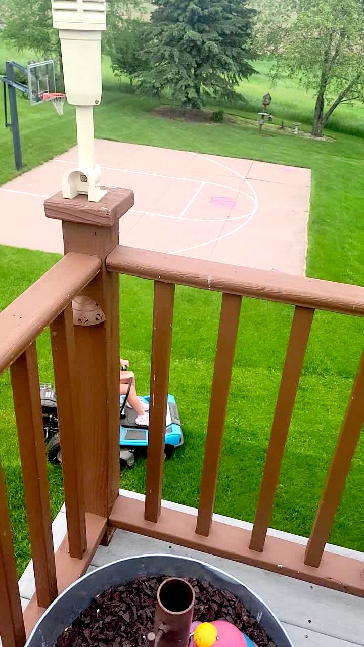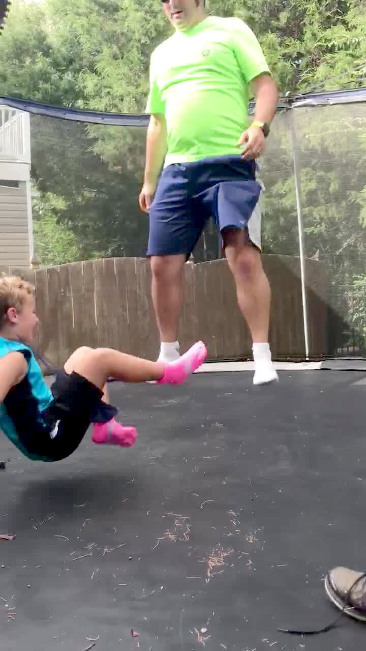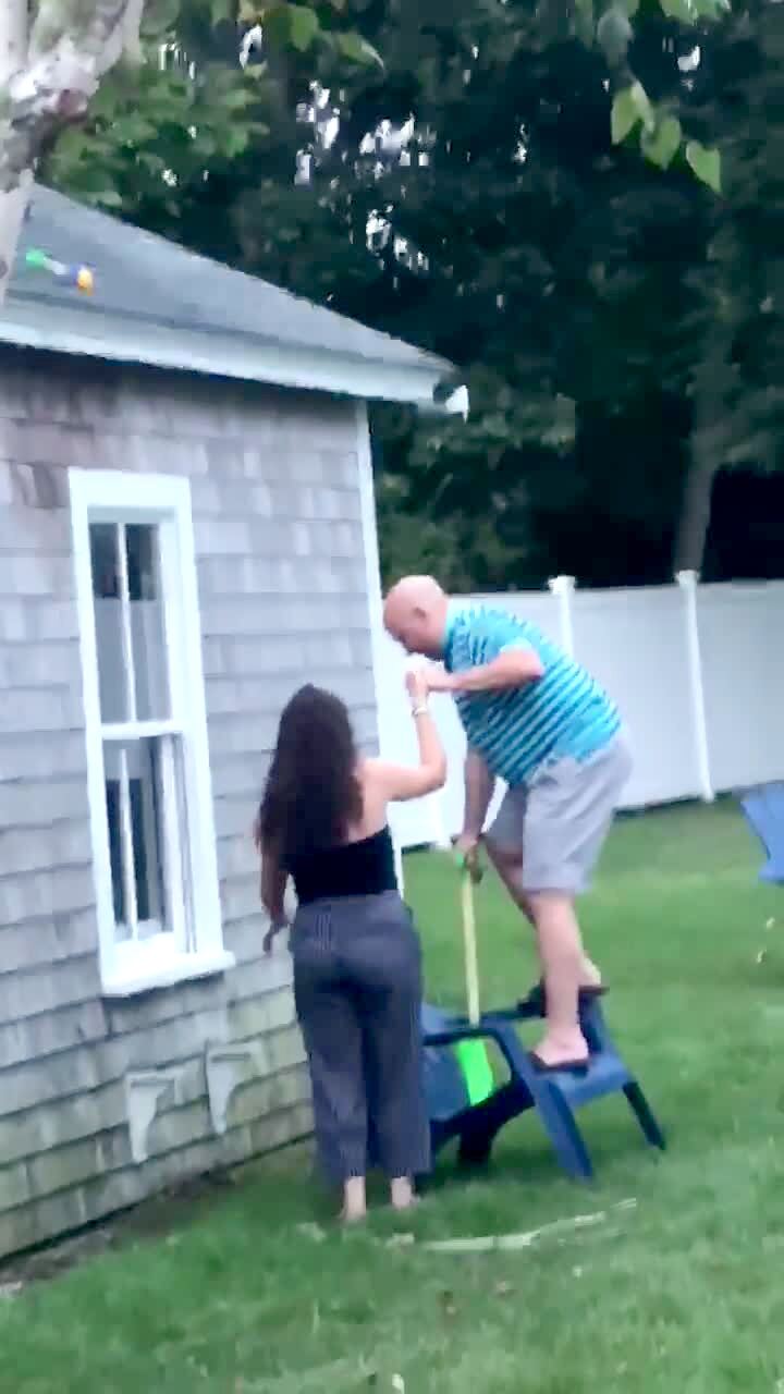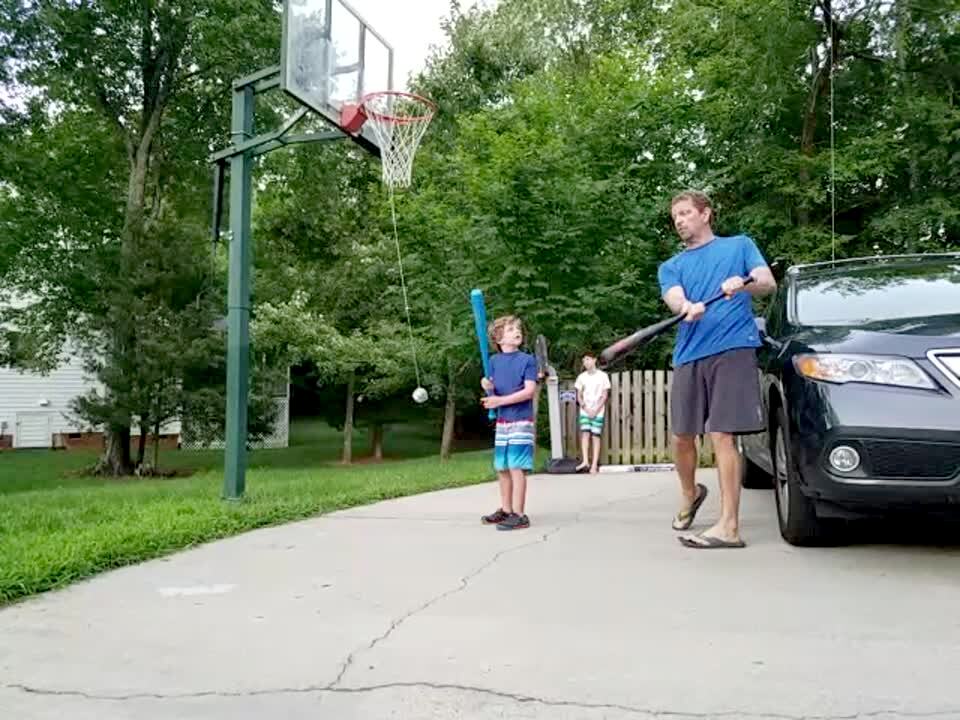 A baseball hangs from a basketball net by a string, and a young boy learns to hit the ball with a baseball bat in his front yard. His dad swings a bat to show him how to hit the ball. The bat swings behind him, and cracks the windshield of the man's car.
