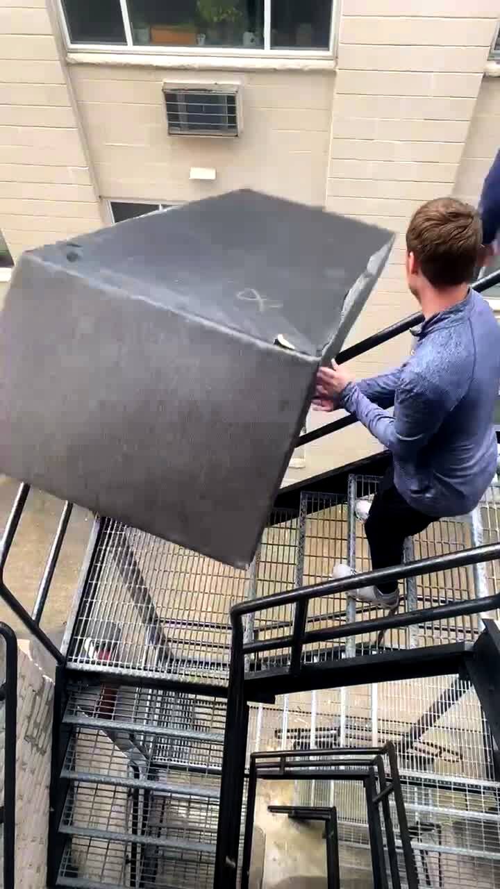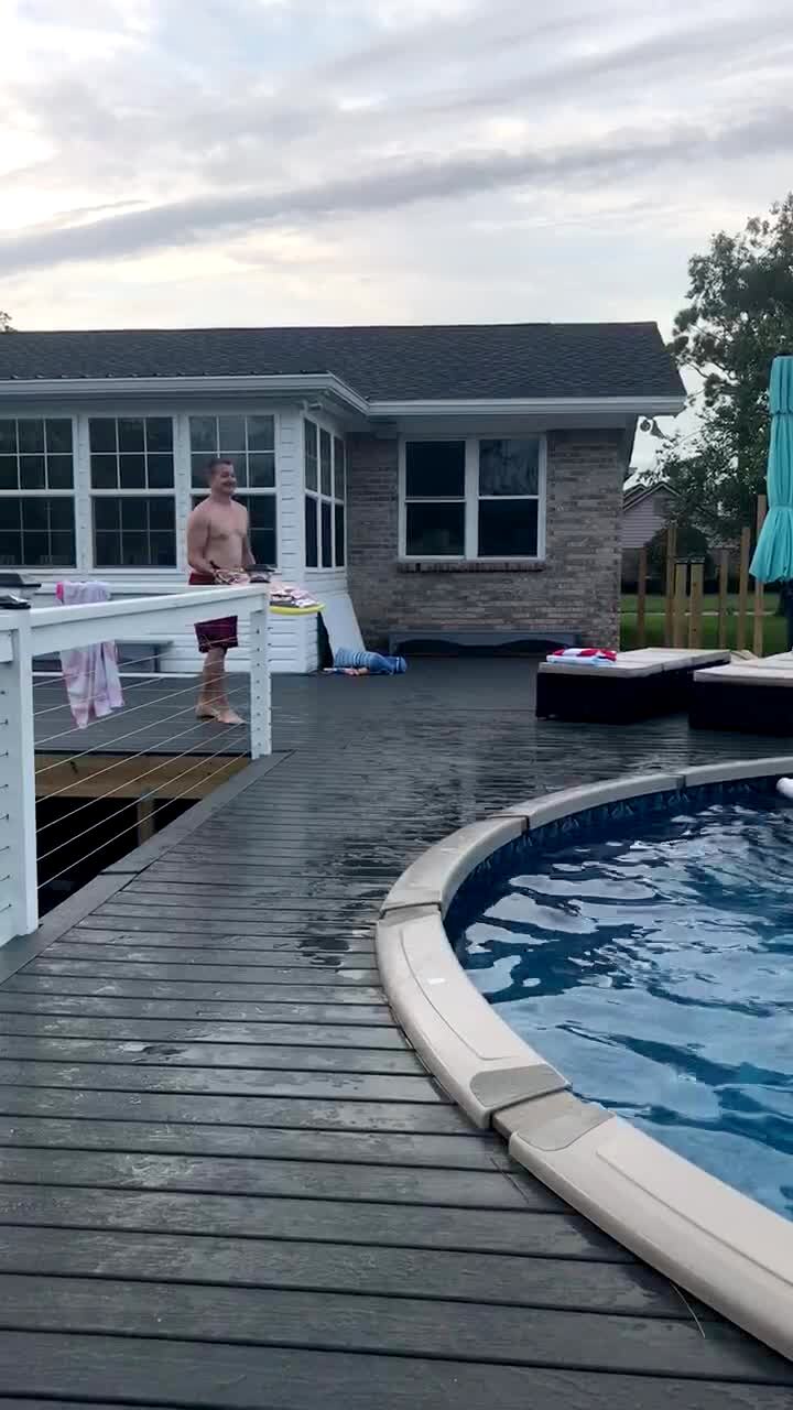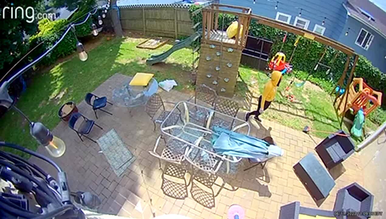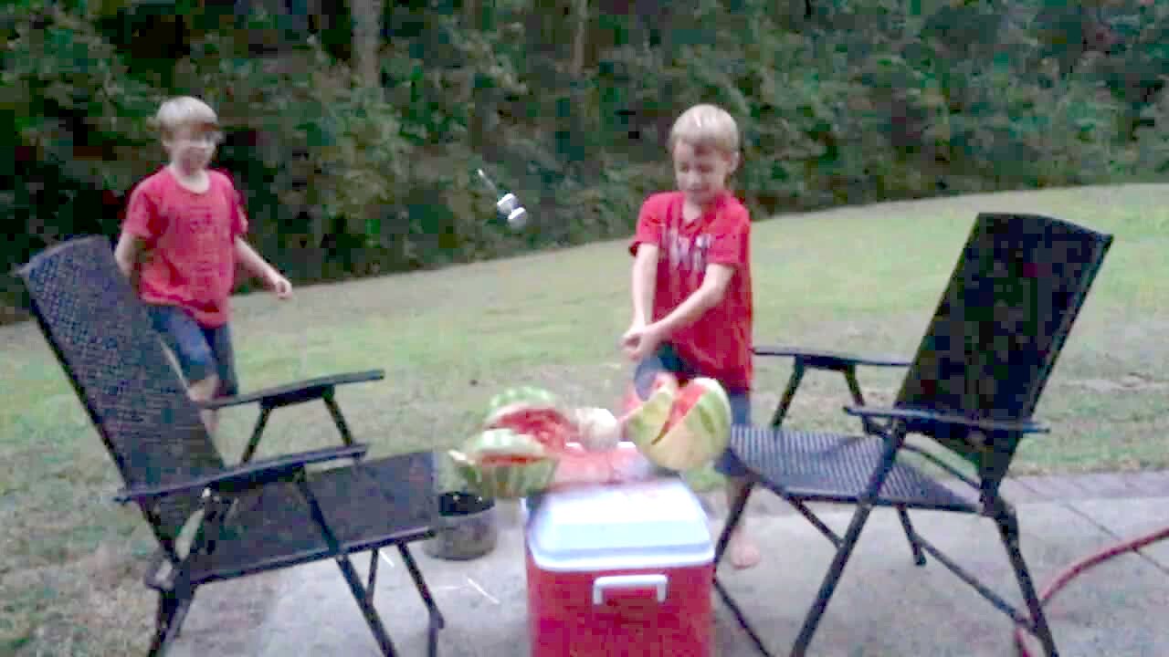 A baseball hangs from a basketball net by a string, and a young boy learns to hit the ball with a baseball bat in his front yard. His dad swings a bat to show him how to hit the ball. The bat swings behind him, and cracks the windshield of the man's car.