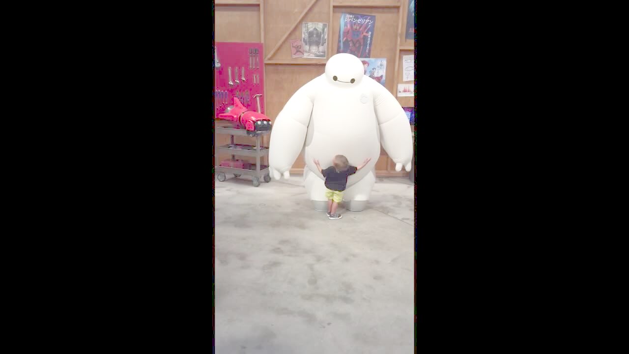 A young boy runs to hug an inflated mascot and bounces off the mascot's stomach.