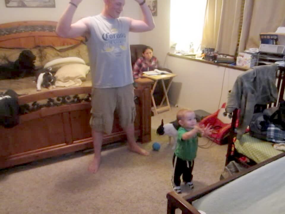 "GROIN BITTER" A tot baby boy waves his hands around while trying to play with an Xbox kinect game with a man indoors. A Boston Terrier dog jumps up and bites the man in the groin.