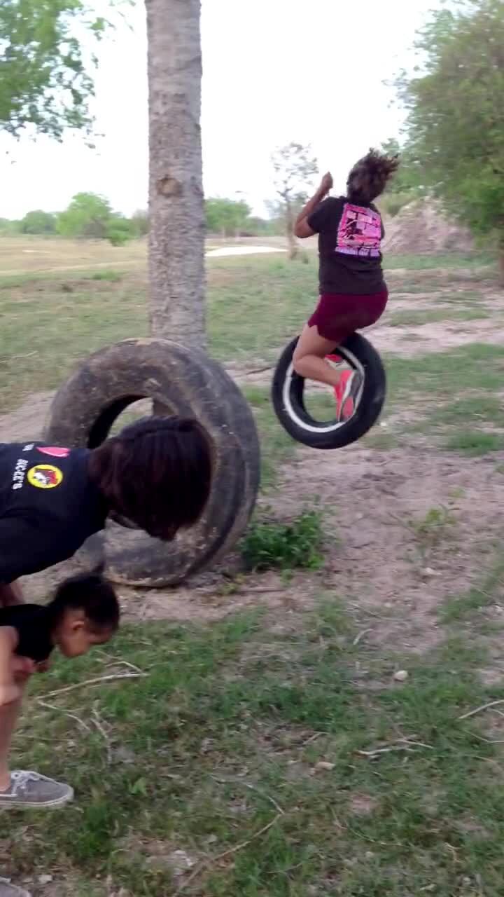 A teen girl runs and jumps onto a tire swing when the rope breaks and she falls outdoors. Featured talent cleared (the teen on the tire swing).