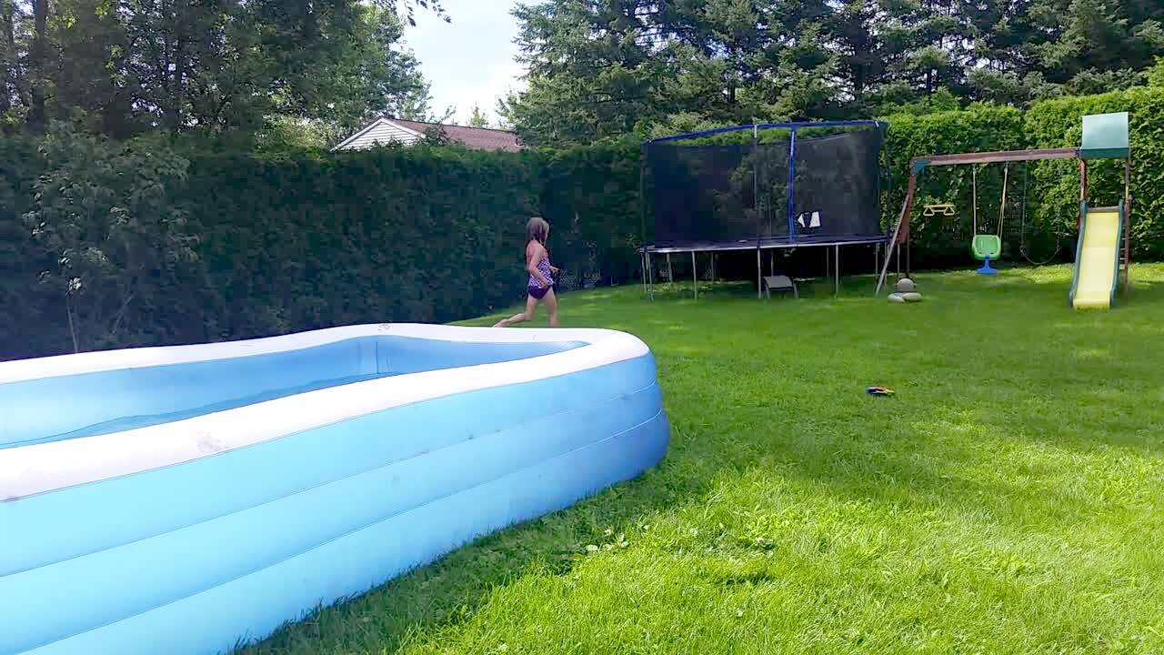 A young girl runs and jumps into an inflatable pool. A tot boy then runs to jump into the pool while holding a small inner tube and pool noodles, but jumps to early and ends up on the ground outdoors.
