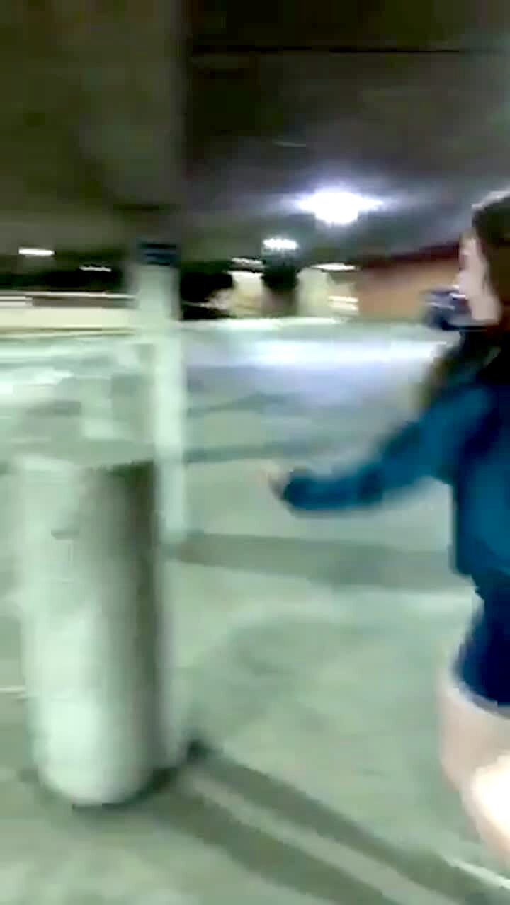 A teen girl falls in a parking structure when her shorts catch on a concrete block as she jumps over it.
