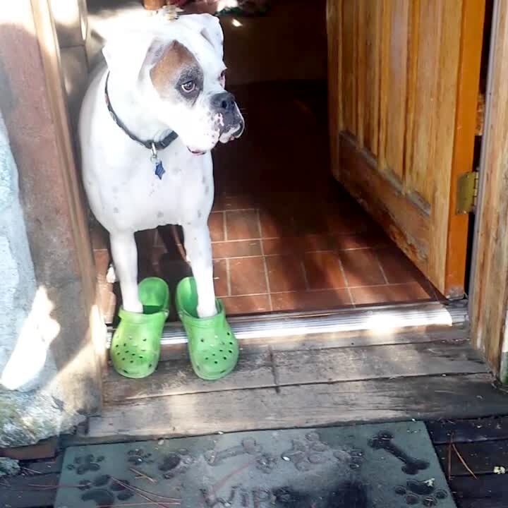 A boxer dog puts his feet in a pair of Crocs shoes and walks outdoors.