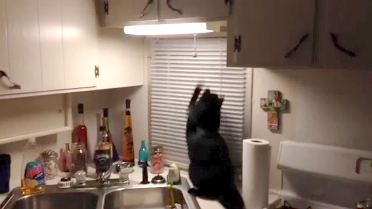 A black cat chases a moth indoors as it flies around a lamp hanging over a kitchen sink. The cat jumps for the moth repeatedly before he incidentally pulls the cord to the lamp and turns the light out.