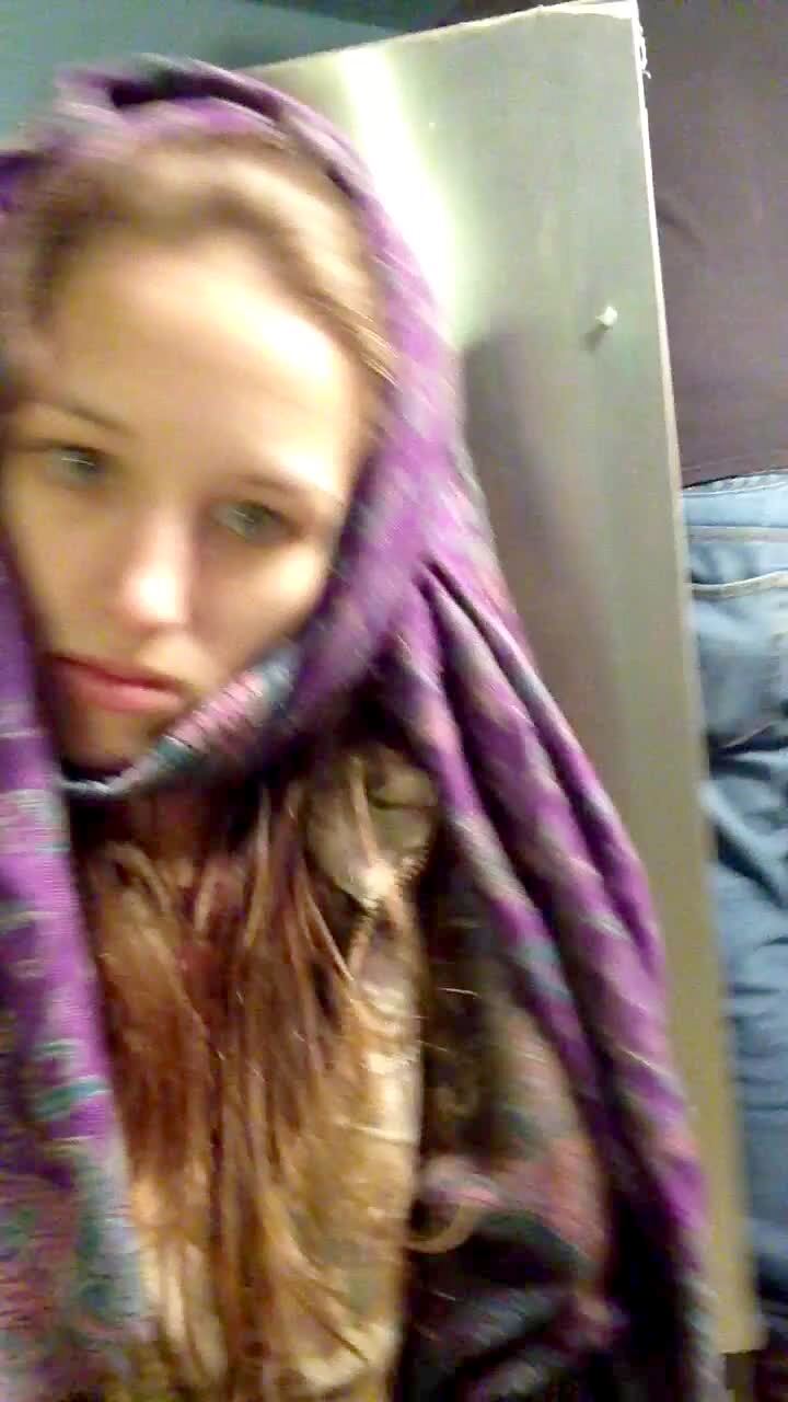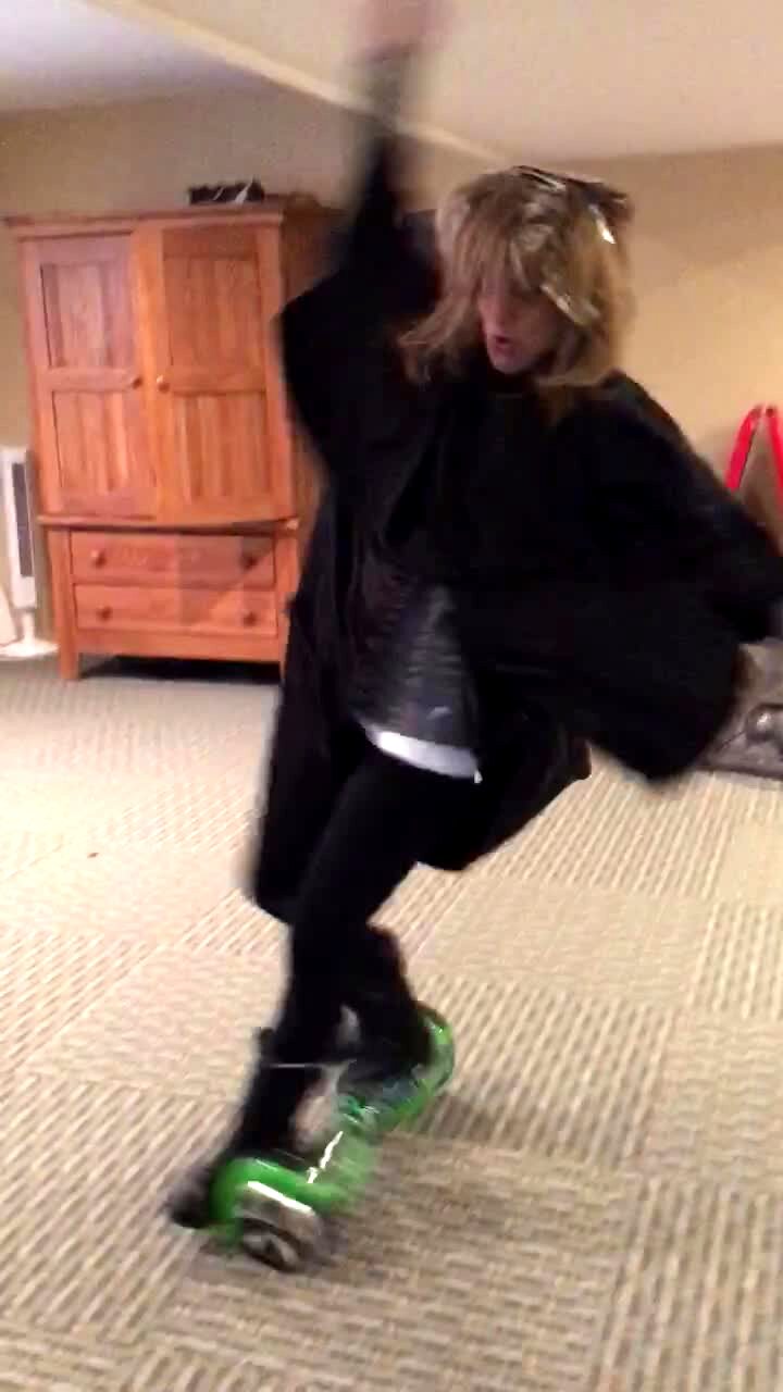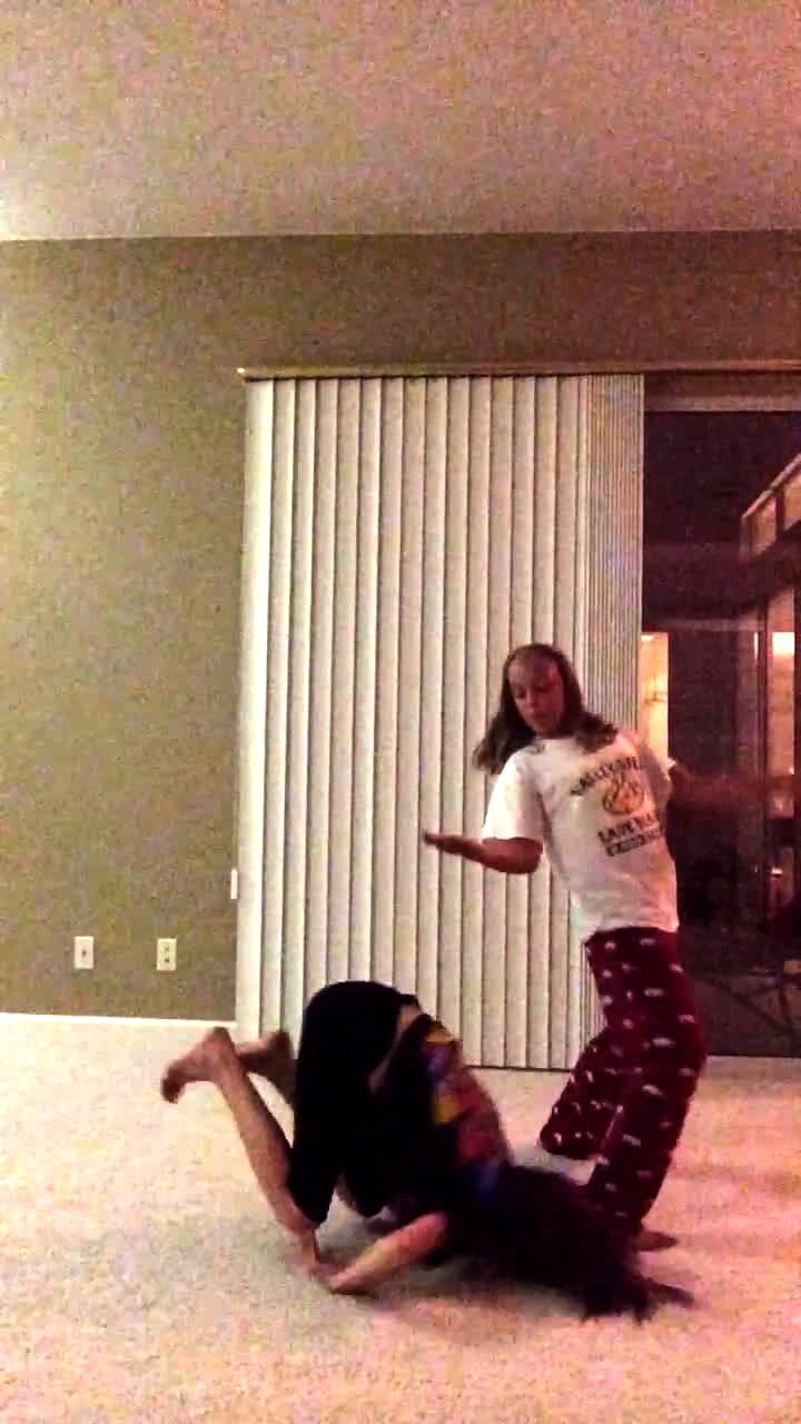 A teen girl dances with a scarf around her head. In the background a man stands on a step stool and gets hit by a moving ceiling fan. Music rights not cleared.