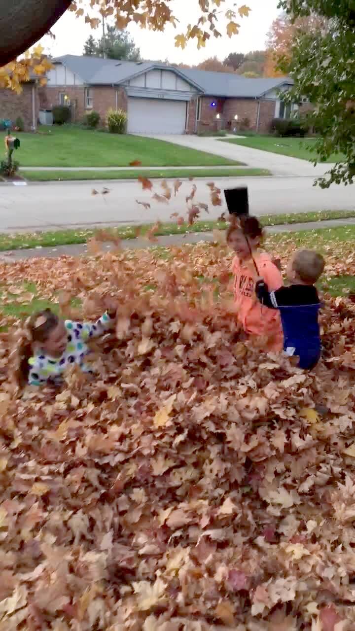 Two girls and a boy play in a pile of leaves outdoors. The boy swings a shovel and hits one of the girls.