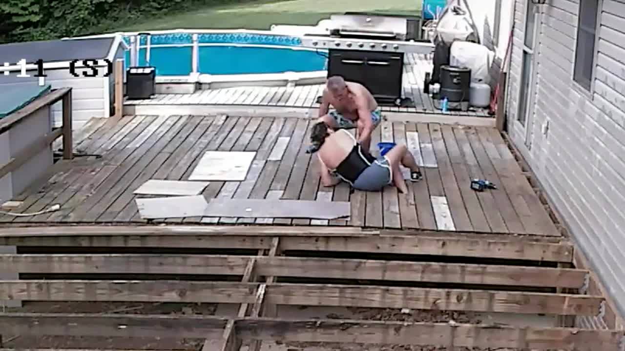 A man and a woman work construction on their backyard deck and the woman steps into a hole and falls down. Security footage.