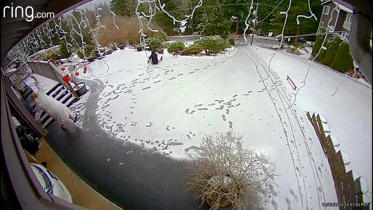 "Downward Dogs" Three dogs walk outside and slide across the icy driveway and fall into the front-yard. A man ties a rope to the porch and slides down to rescue them when his wife slips and falls by the garage. Security footage.