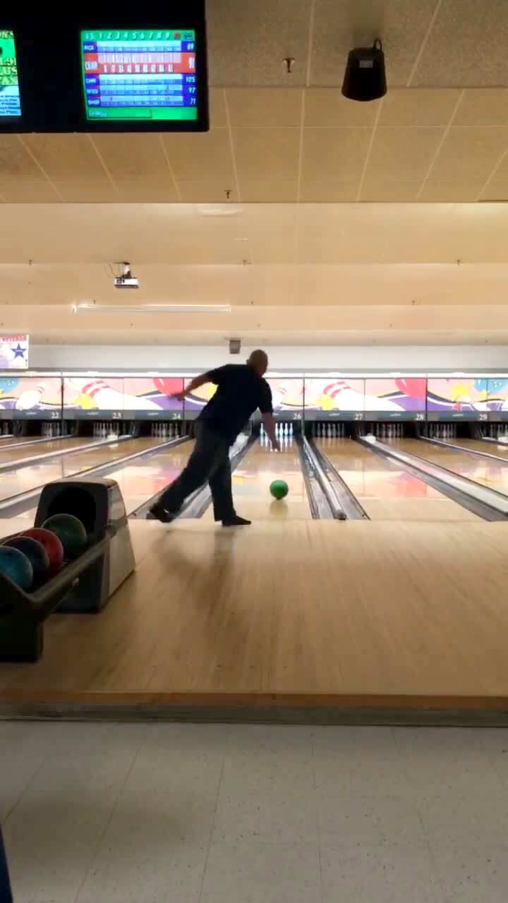 A man stumbles as a bowls at a bowling alley, falling into a neighboring lane.