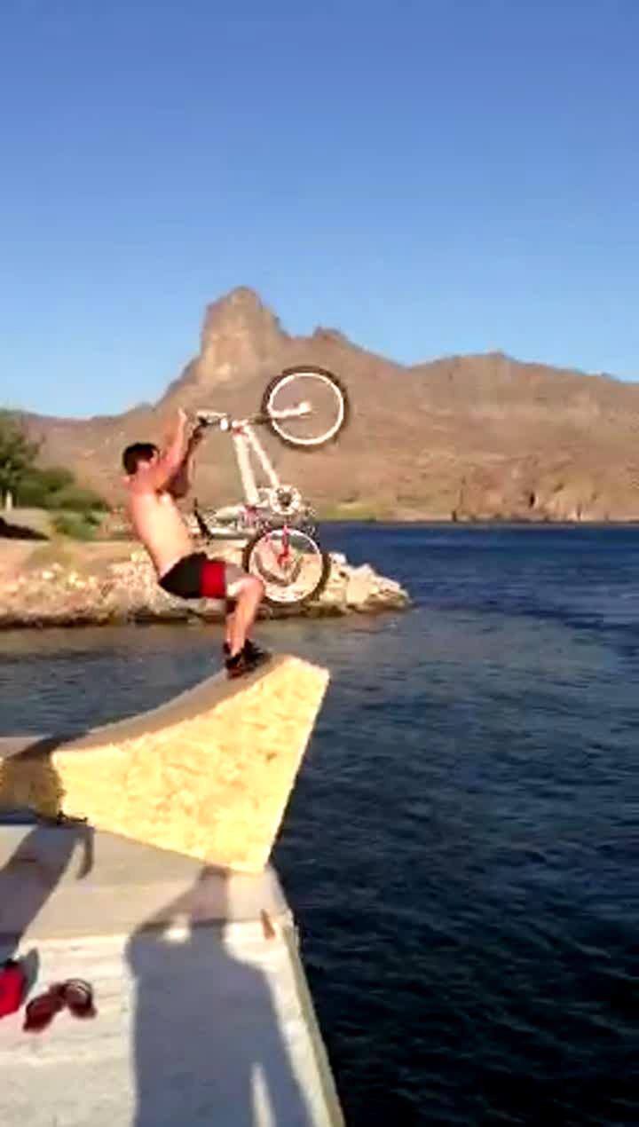 A man rides a bicycle on a ramp on a pier. The man, bike, and ramp all go in the water. Featured talent cleared ONLY (the man on the bike).