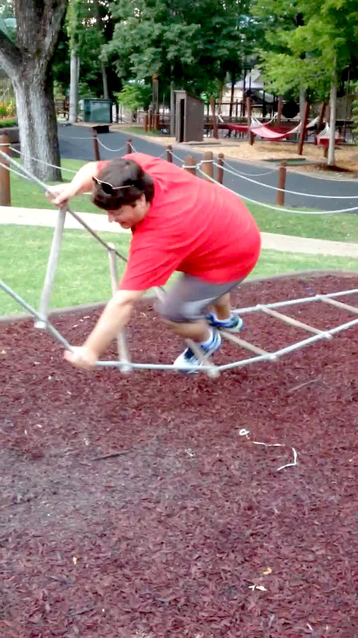 A man climbs across a rope ladder at a playground. He flips over while trying to hang on before falling to the ground.