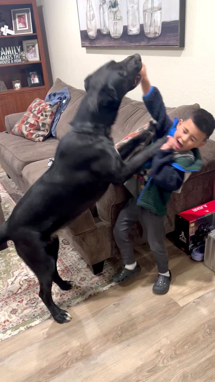 A young boy holds up a treat to train a large dog in the living room. He says "up" and the dog jumps and pushes him to the floor.
