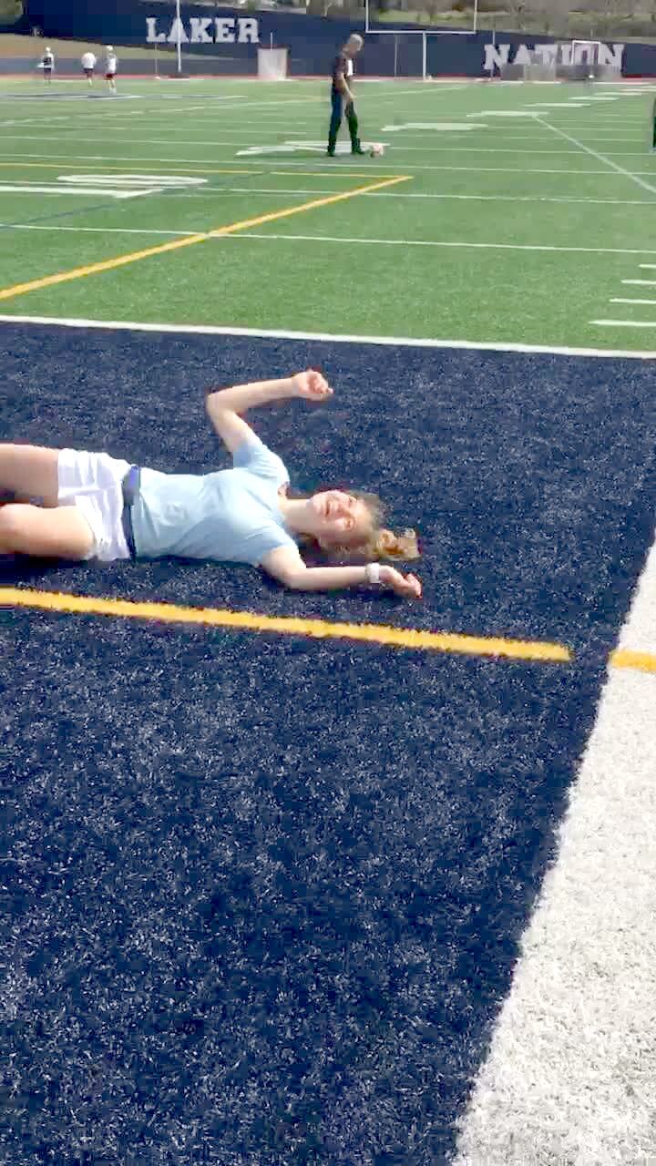 A teen girl trips and falls on a wind resistance training parachute while she races against another teen girl on a school track. Featured talent cleared ONLY (the teen girl who falls down).