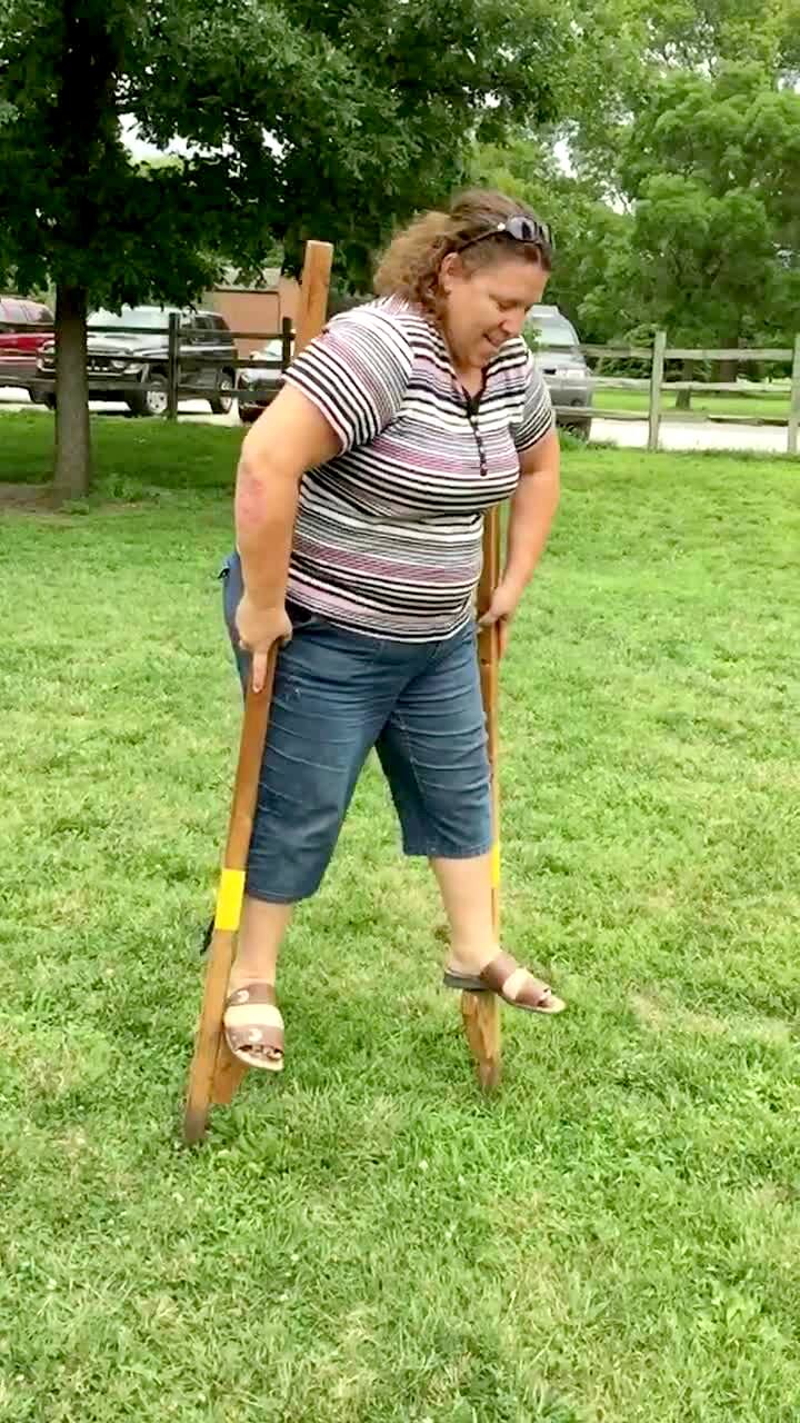 A woman retraces the steps of someone who has fallen in the mud in her front yard, and then she turns the camera on herself covered in mud and says "I really hope that they're okay."