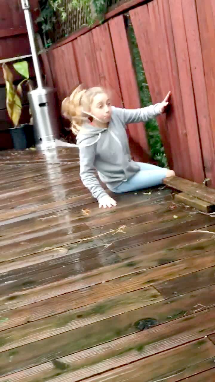 A teen girl shoots a basketball on a porch and then slips and slides into a wooden fence. The wooden slats fall where she crashes through the fence.
