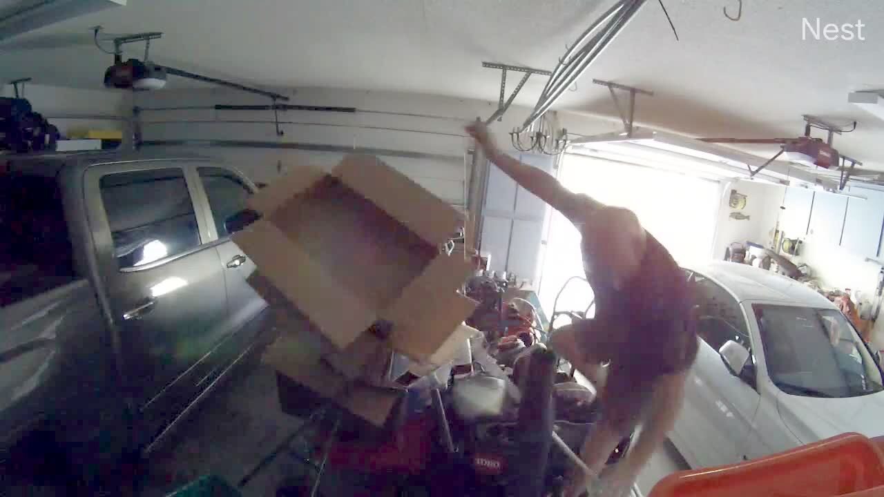 A man steps on a pile of things in a garage to fix a garage door opener. Then he falls. Security footage.