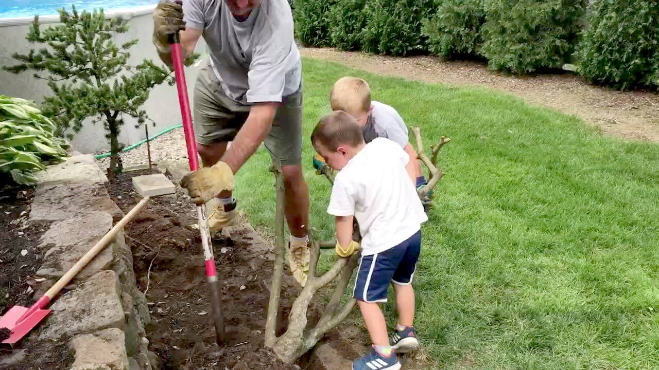 Two young boys pull at a bush while their grandpa digs at its roots with a shovel. They all start to push on it and it suddenly comes out of the ground and they all fall and he falls on top of one.