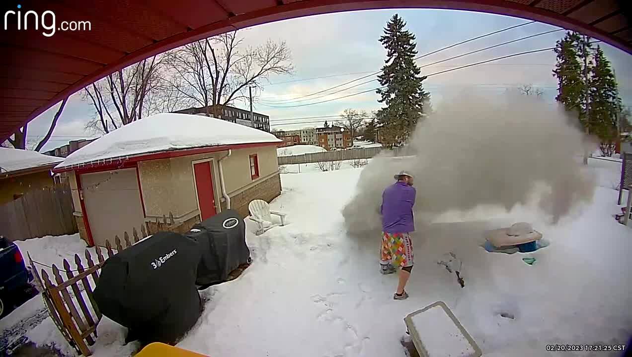 A man attempts to dump dirt and dust from a vacuum cleaner out into the yard but the wind blows it all back into his face. Security footage.
