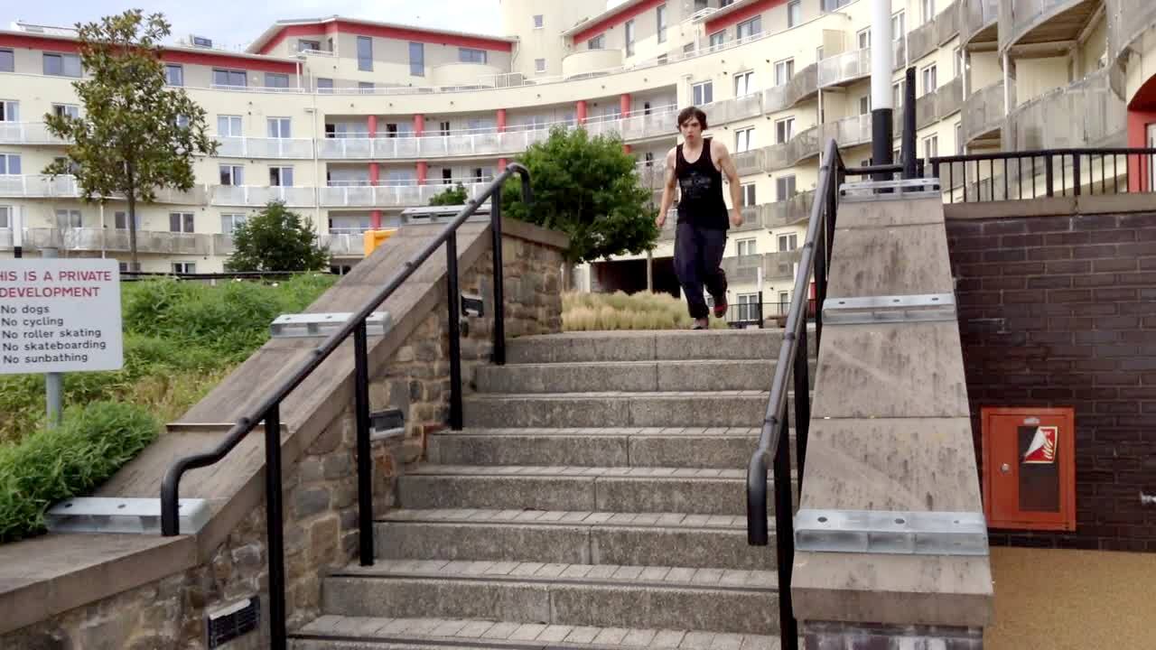 A man does a flip over a staircase outdoors and runs and does a cartwheel but crashes into a pole.