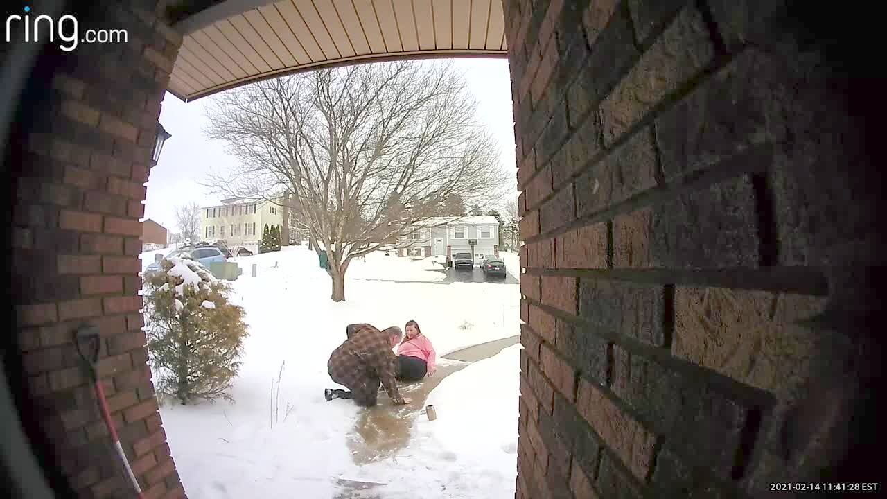 On Valentine's Day morning, a woman walks out the front door of a house and slips on winter snow and ice on the sidewalk. Her husband walks after her and he slips and falls too. His coffee tumbler bounces off the ground and hits him on the head. Ring home security camera