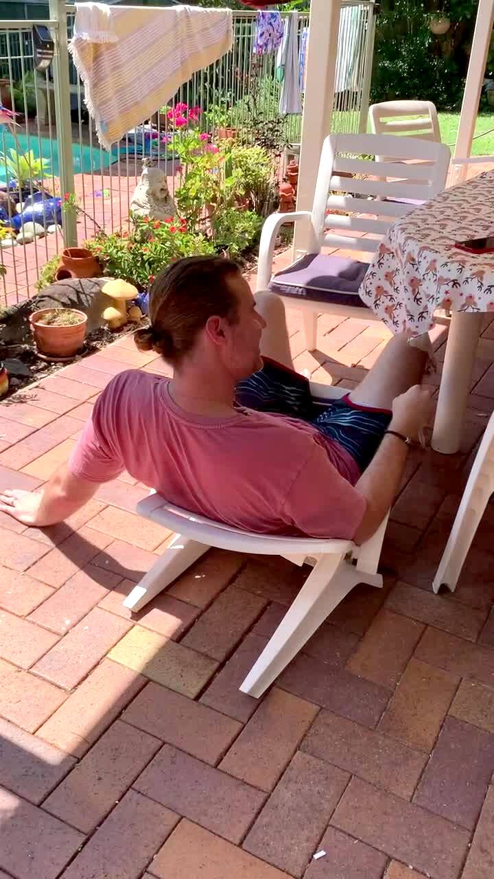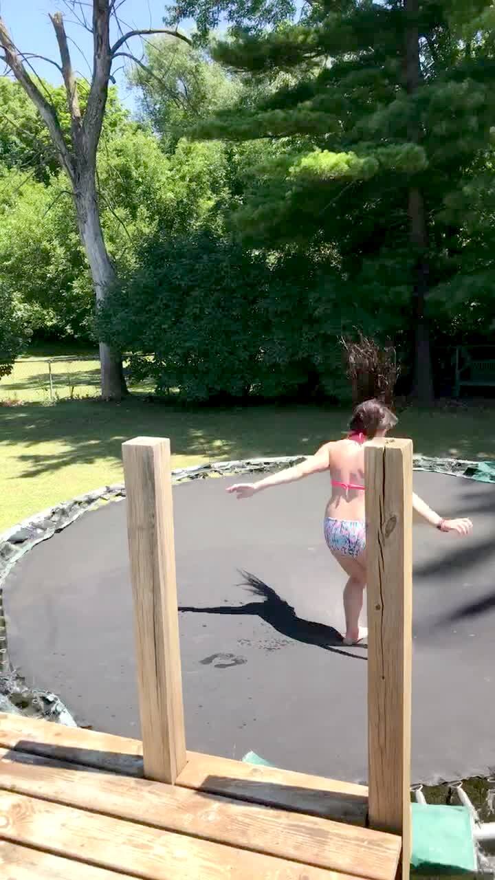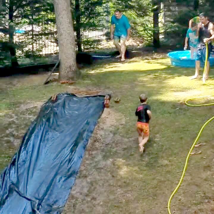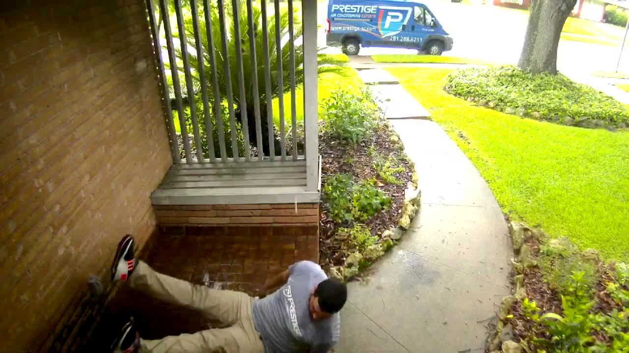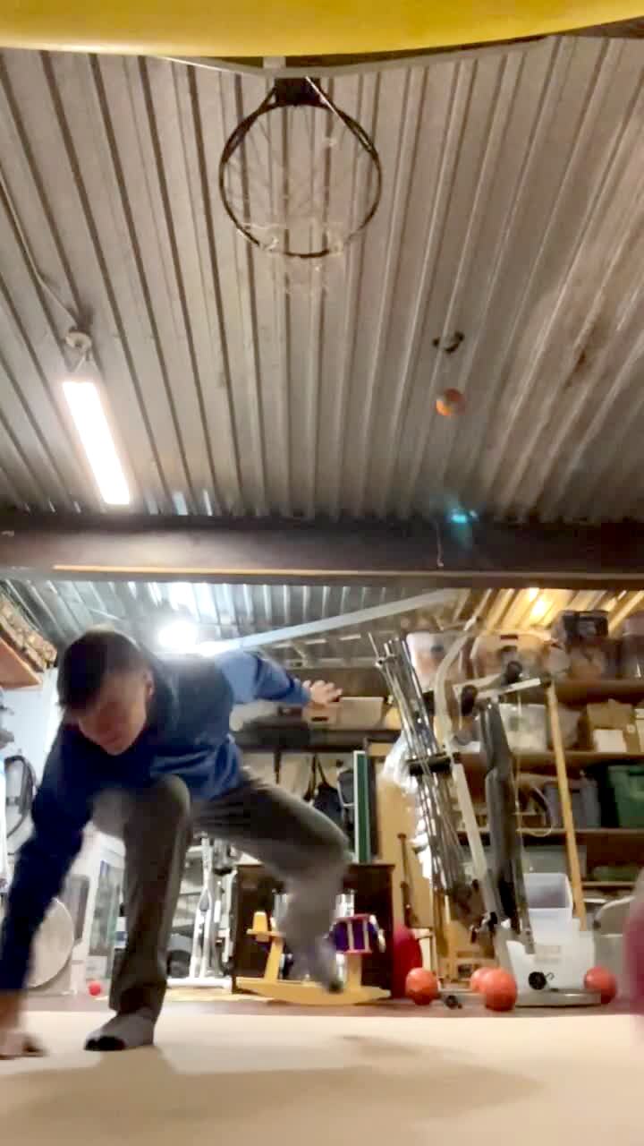 A baseball hangs from a basketball net by a string, and a young boy learns to hit the ball with a baseball bat in his front yard. His dad swings a bat to show him how to hit the ball. The bat swings behind him, and cracks the windshield of the man's car.