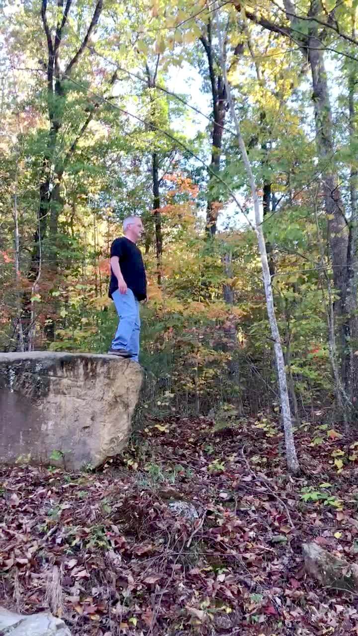 A man in a forest jumps from a large rock and tries to grab onto a thin tree and it snaps in half and he falls down and lands hard on his back.