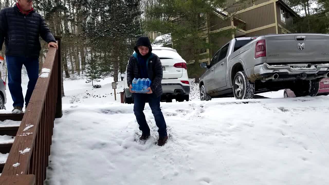 A teen boy carries a package of water bottles down a hill in the winter snow, then he slips and falls and the bottles land on his groin before they slide onto the ground in his yard.