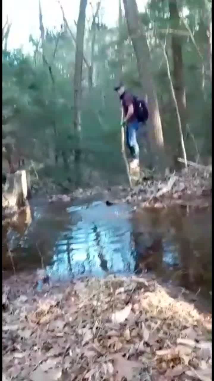 A teen boy stands on a tree stump next to a stream in the woods and uses a large stick to vault himself over the water. The stick breaks and he falls in the water.