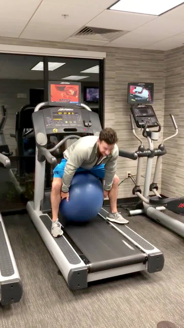 A man puts a large exercise ball on a treadmill and tries to sit on it, but it shoots out from under him in a gym.