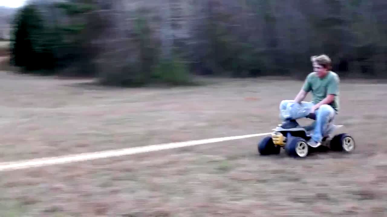 A teen boy rides a toy 5-wheeler and gets pulled by a ranger with a rope. The toy 5-wheeler splits in two and the teen boy falls off.
