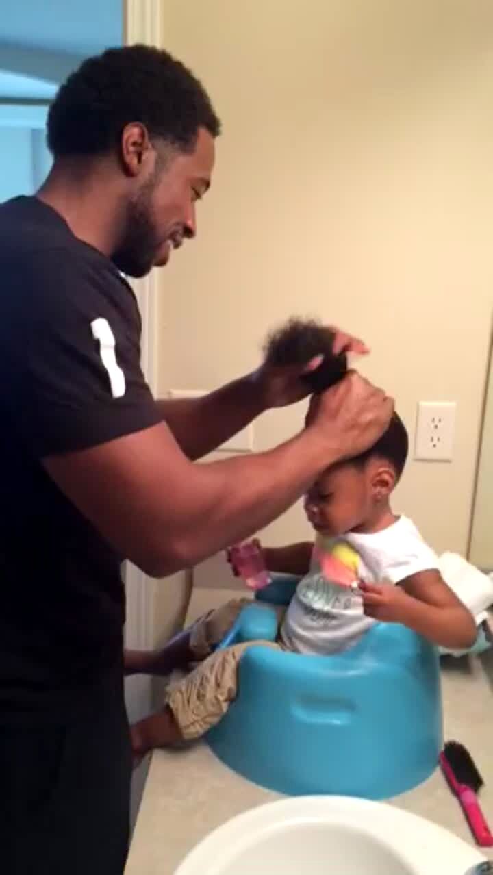 "Dad Hair Day" A man struggles to put a tot girl's hair into a pony tail at home. When he puts the band on her hair, it springs off and her hair pops up in two parts.