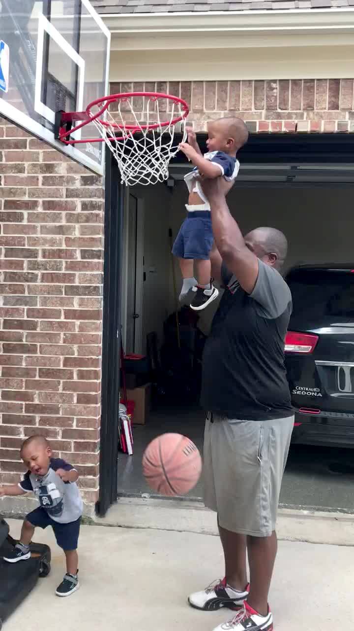 A man holds a tot boy up to dunk a basketball into a hoop in the driveway and the ball goes through and then comes down and hits his twin brother in the head.